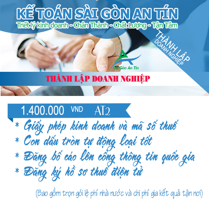 Đội ngũ nhân viên có nhiều kinh nghiệp trong việc thực hiện các thủ tục hành chính tại cơ quan nhà nước. Kế Toán Sài Gòn An Tín chuyên cung cấp các dịch vụ THÀNH LẬP CÔNG TY/DOANH NGHIỆP.