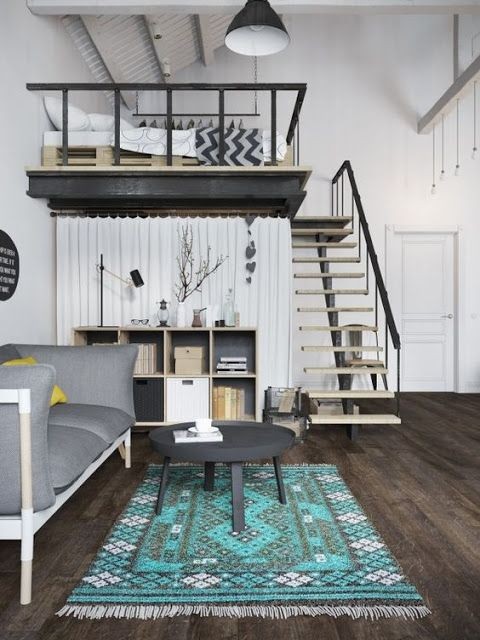 | Mẫu 5 Chỗ ngủ rất ấm áp bên trên gác. Cầu thang và nền giả gỗ phối cùng tông màu sơn trắng. Bàn ăn cho hai người được thiết kế nhỏ gọn. Bếp và phòng tắm bên dưới gác. | Mẫu 6 Với nền trắng và sơn tường màu trắng. Bàn ăn cũng là bàn làm việc bố trí gọn gàng dưới chân cầu thang. Bộ sofa nằm bên góc phải. Nhấn nhá thêm vài bức tranh treo tường. |